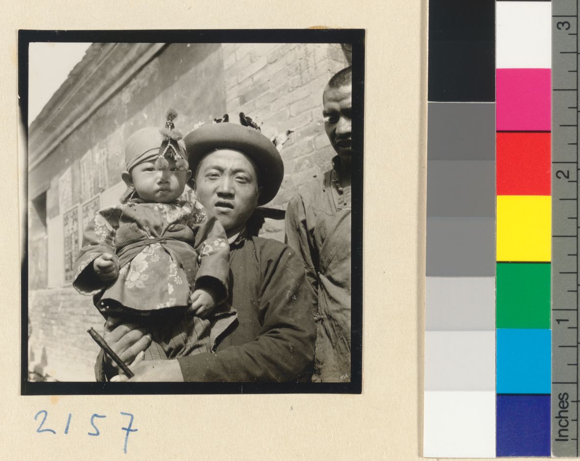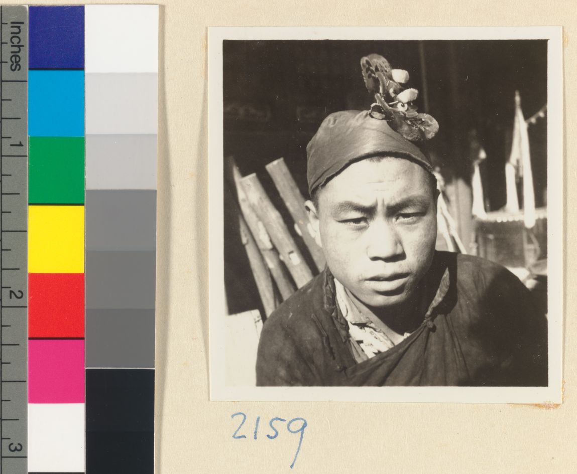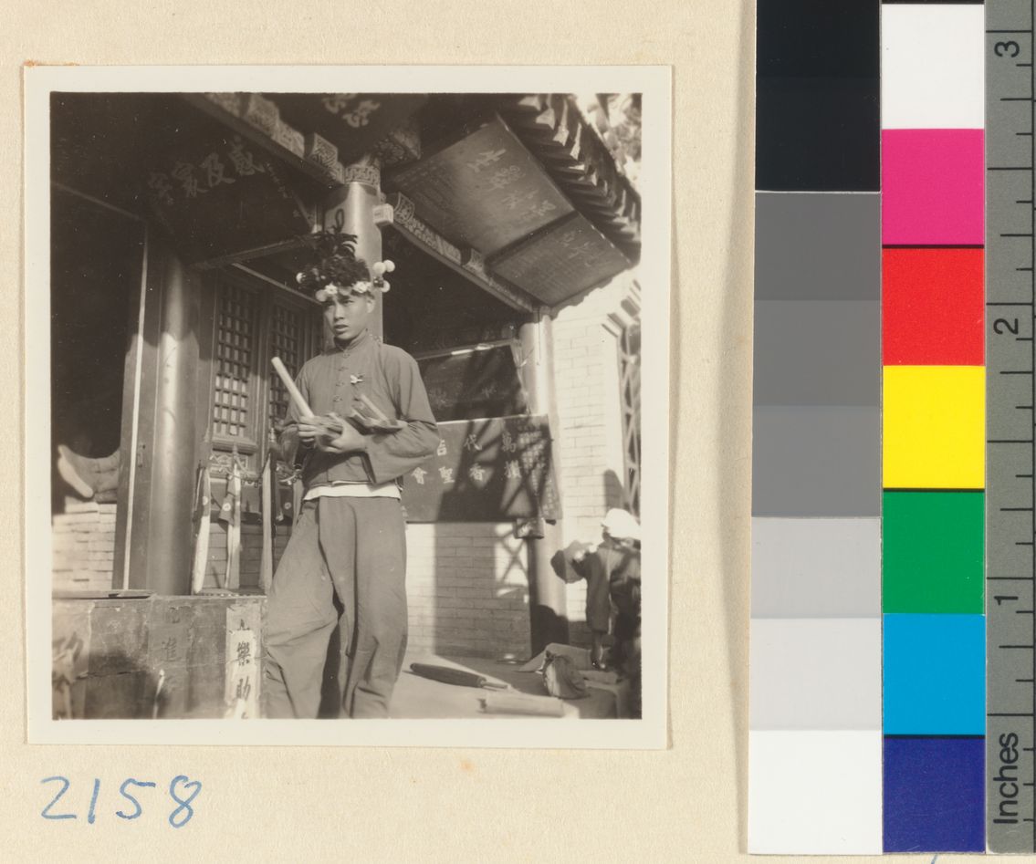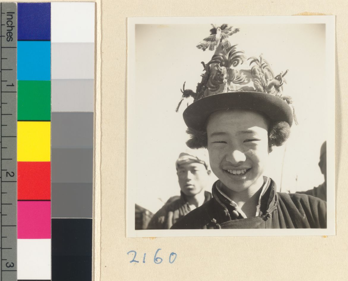 Boy wearing a hat decorated w…
