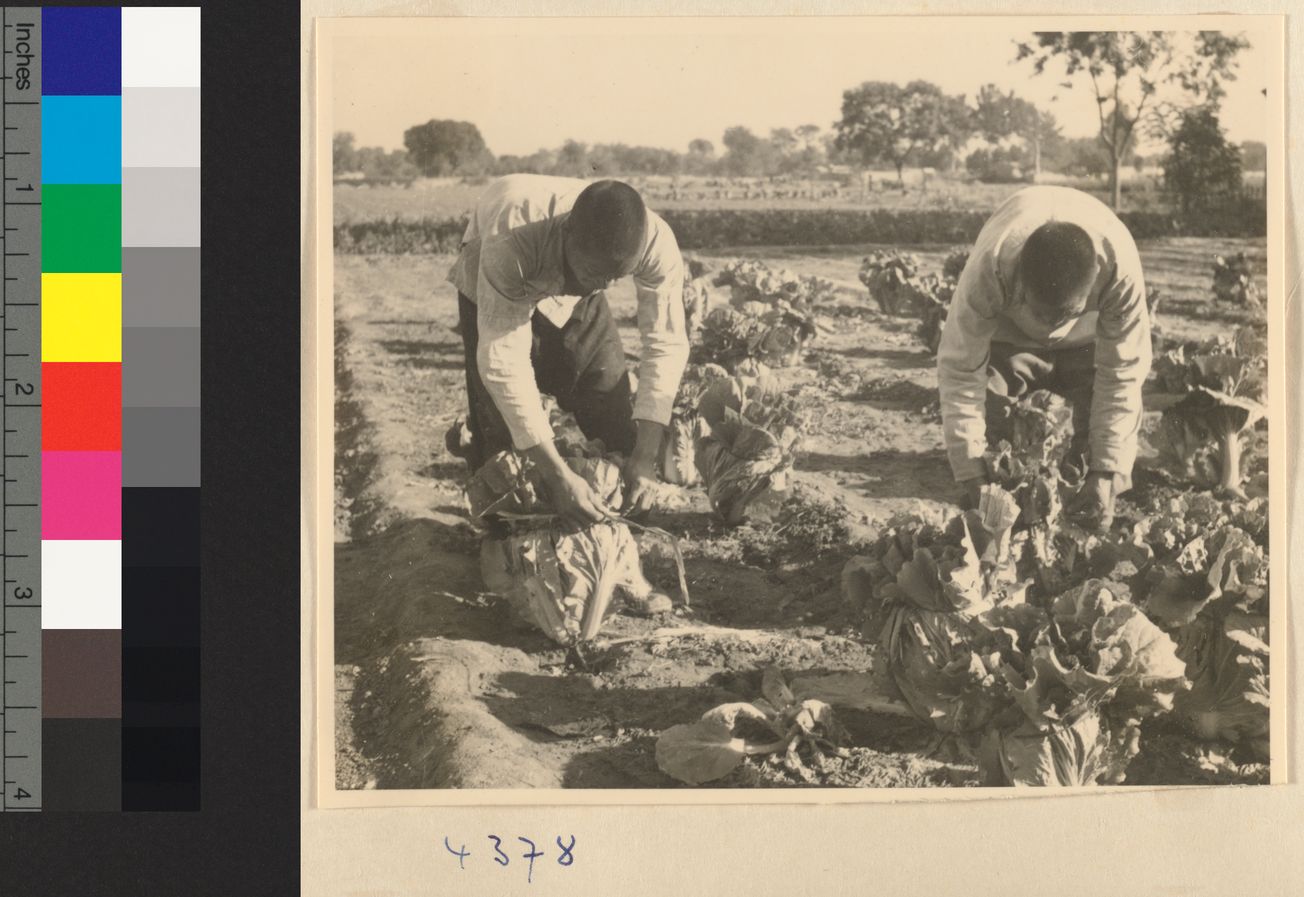 Field workers tying up cabbag…