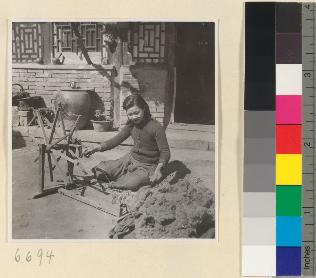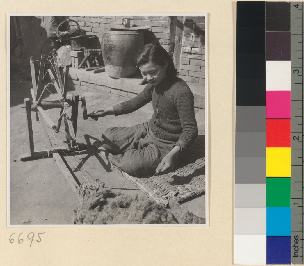 Woman spinning cotton outdoors