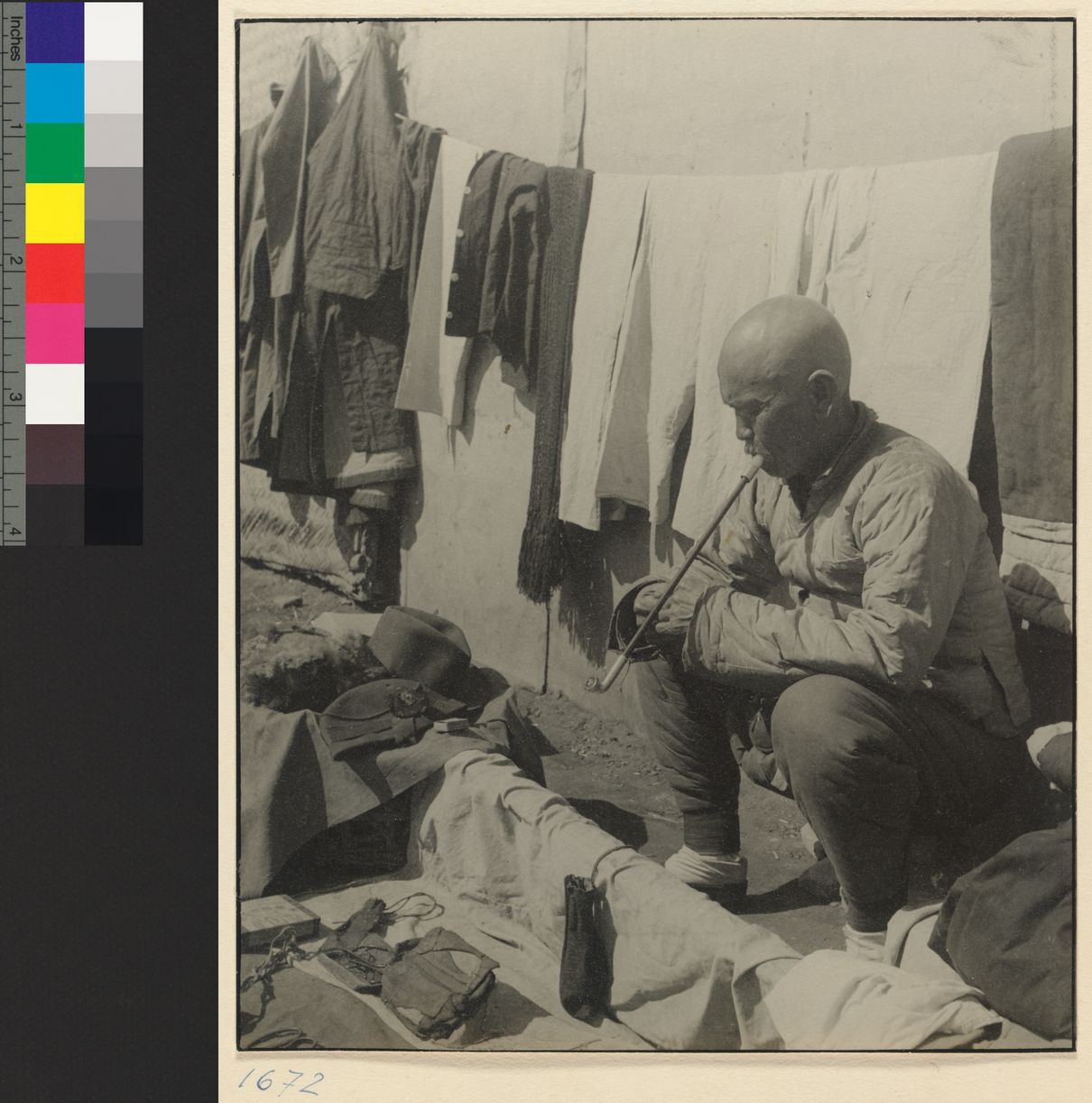 Clothes hawker sitting with h…