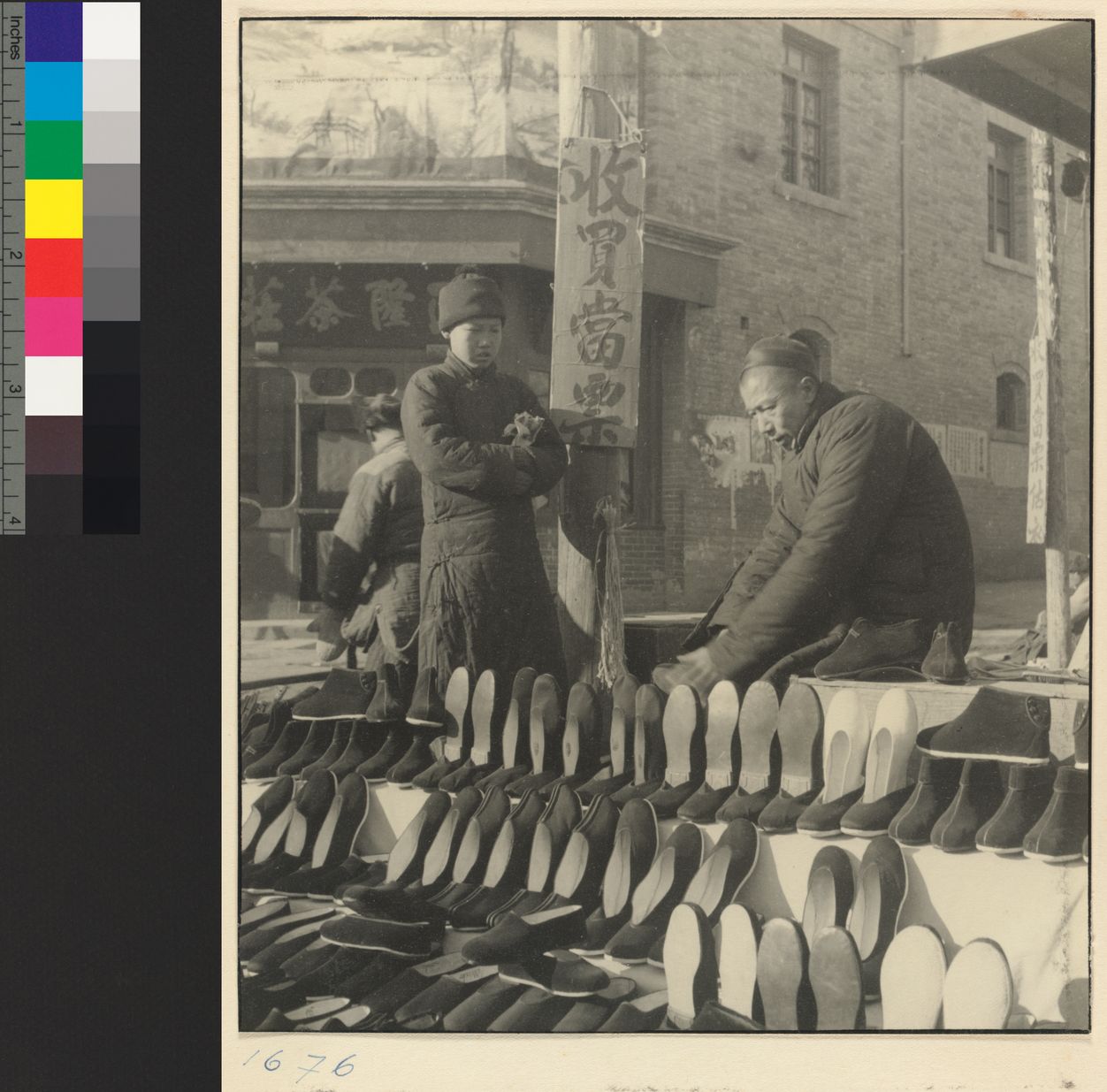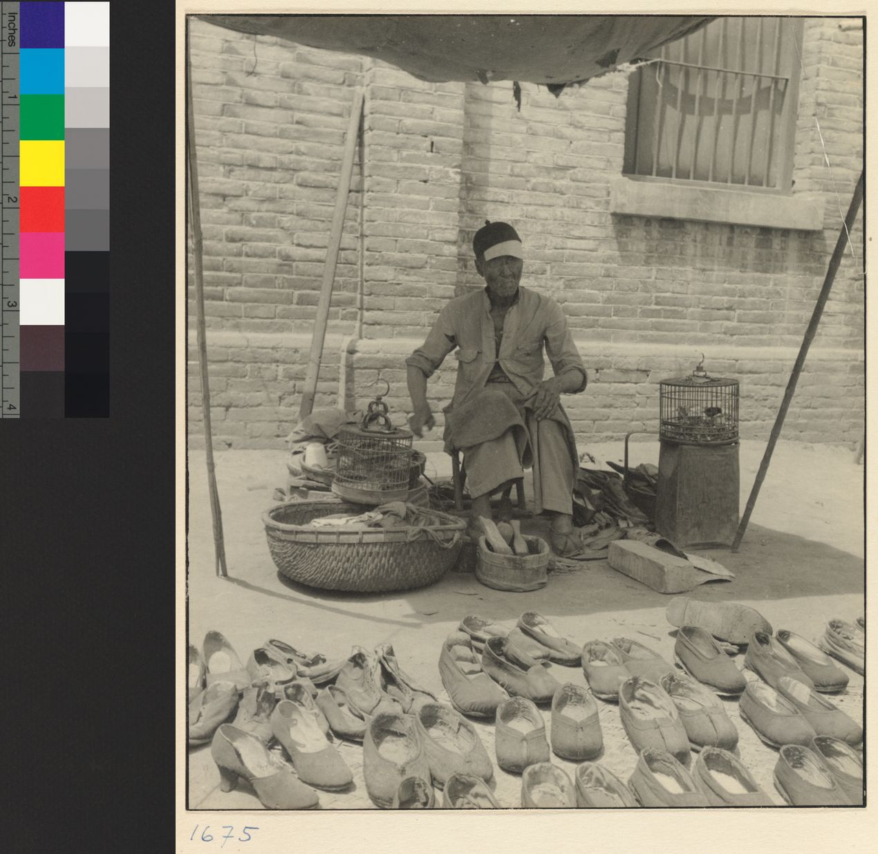 Shoe vendor seated with caged…